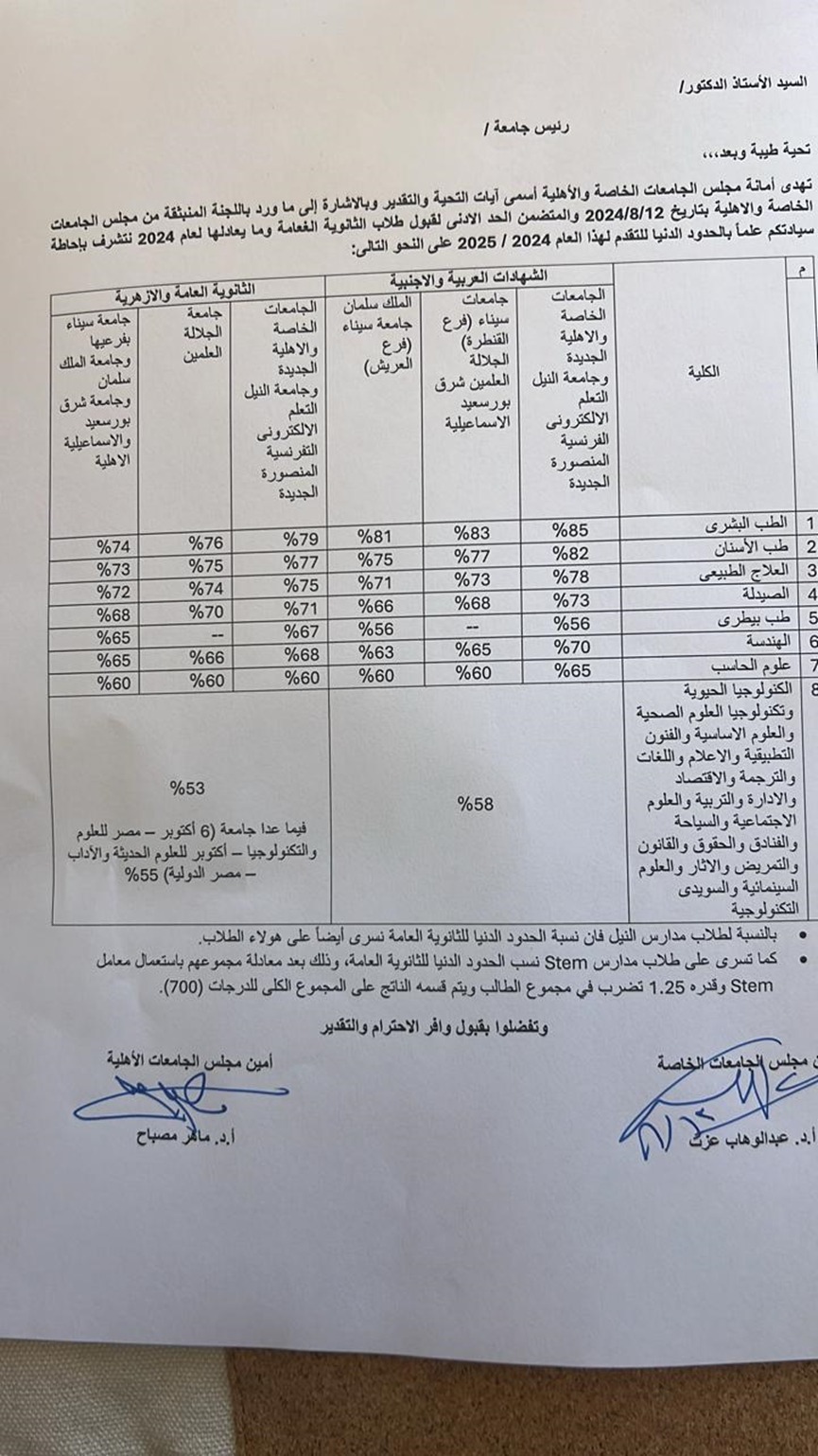 وأقر المجلس الحدود الدنيا للتقدم للكليات بالجامعات الخاصة والأهلية للشهادة الثانوية العامة وما يعادلها، وجاءت على النحو التالي: