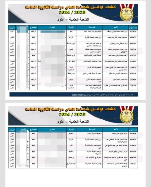 أسماء أوائل علمي علوم 2024 بعد إضافة درجتي الفيزياء