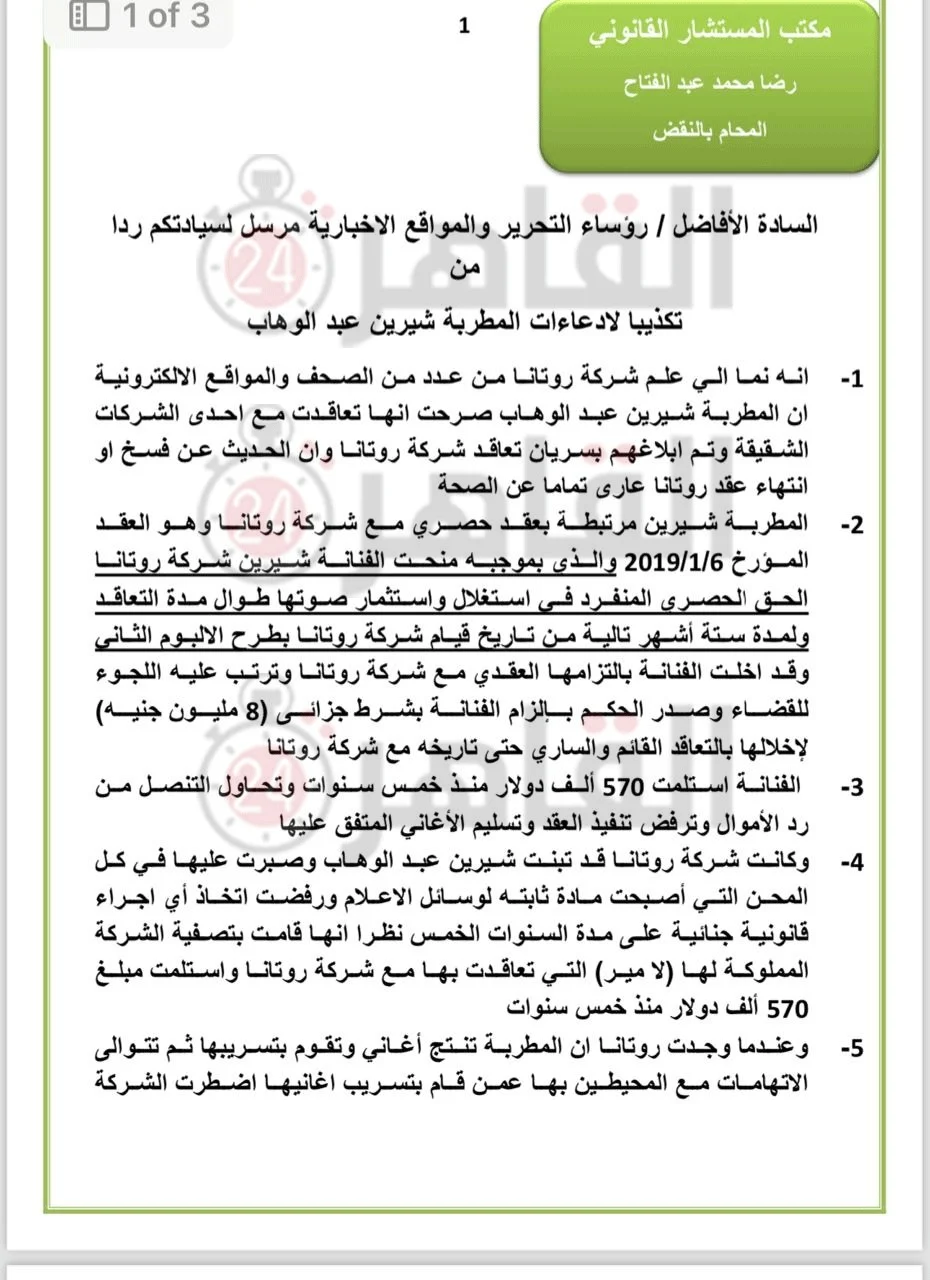 - شيرين لم تحصل على مبلغ مالي وترفض رده كما تزعم روتانا