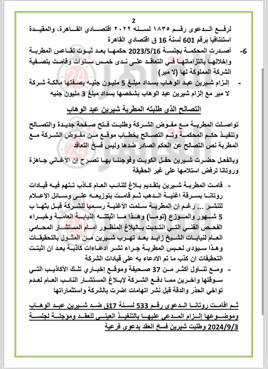 - ادعاء شركة روتانا بسريان تعاقد شيرين عبد الوهاب معها مخالف للأحكام القضائية