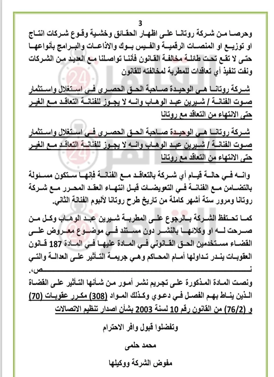 - سيتم مقاضاة شيرين عبد الوهاب وأي شركة تتعاقد معها
