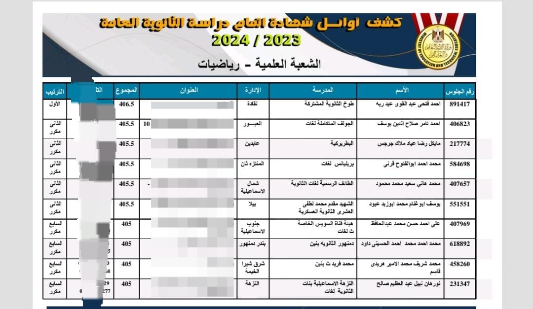 بعد تعديل نتائجهم.. ننشر أسماء أوائل الثانوية العامة 2024 علمي رياضة