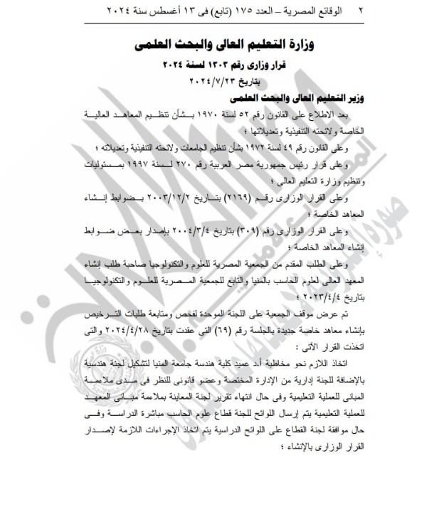 الجريدة الرسمية تنشر قرار إنشاء المعهد العالي لعلوم الحاسب بالمنيا