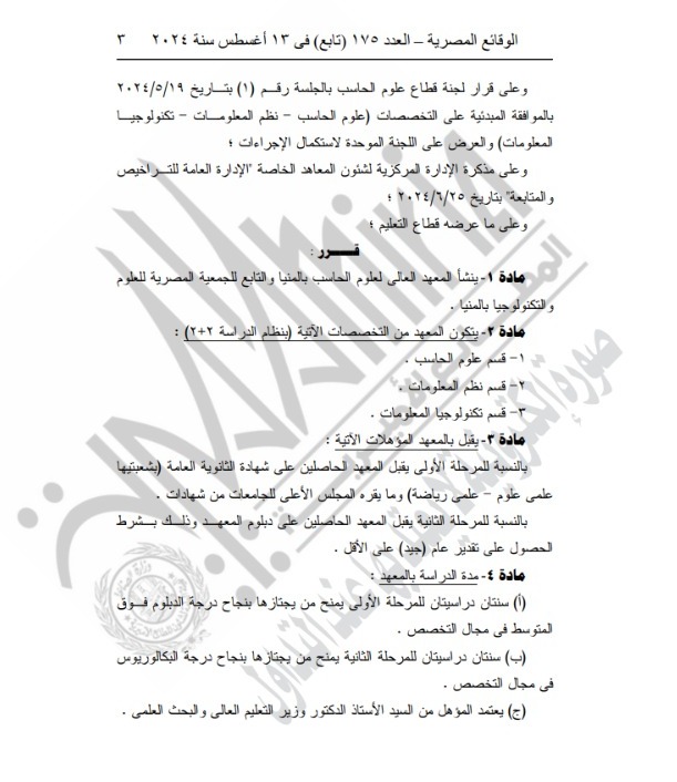 وأوضحت الجريدة الرسمية، أن المادة الأولى تضمنت إنشاء المعهد العالي لعلوم الحاسب بالمنيا والتابع للجمعية المصرية للعلوم والتكنولوجيا بالمنيا، كما أن المادة الثانية: المعهد يتكون من التخصصات الآتية بنظام الدراسة 22: - قسم علوم الحاسب، قسم نظم المعلومات، قسم تكنولوجيا المعلومات، في حين تكون المادة الثالثة بأن يقبل المعهد المؤهلات الآتية بالنسبة للمرحلة الأولى: