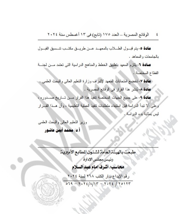 وتابعت الجريدة الرسمية: أن المادة الرابعة تشمل مدرة الدراسة بالمعهد منها سنتان دراسيتان للمرحلة الأولى يمنح من يجتازها بنجاح درجة الدبلوم فوق المتوسط في مجال التخصص، وسنتان دراسيتان للمرحلة الثانية يمنح من يجتازها بنجاح درجة البكالوريوس في مجال التخصص، ويعتمد المؤهل من الدكتور أيمن عاشور وزير التعليم العالي والبحث العلمي.