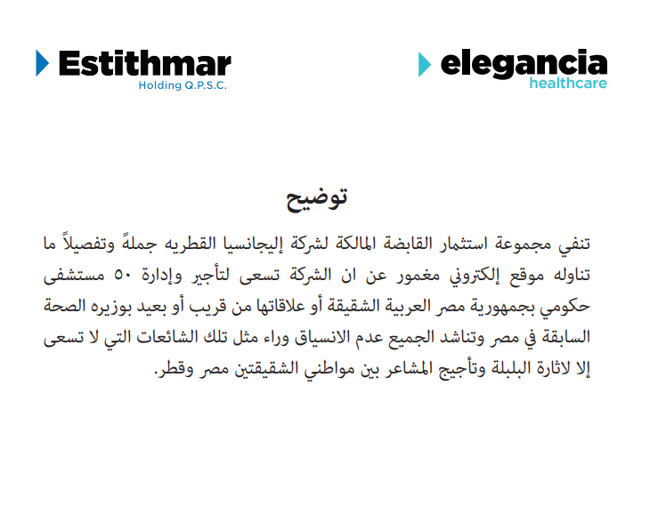 على إثر ما تداوله هذا التقرير، أصدرت مجموعة استثمار القابضة المالكة لشركة إليجانسيا القطرية، بيانًا صحفيًا، تنفي فيه مزاعم سعي الشركة لتأجير وإدارة 50 مستشفى حكوميًا بجمهورية مصر العربية، وكذلك نفت علاقاتها من قريب أو بعيد بوزيرة الصحة السابقة في مصر، الدكتورة هالة زايد.