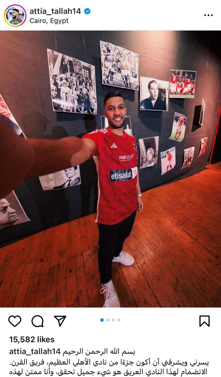 وكتب عطية الله على حسابه الشخصي عبر موقع التواصل الاجتماعي إنستجرام: “بسم الله الرحمن الرحيم.. يسرني ويشرفني أن أكون جزءًا من نادي الأهلي العظيم، فريق القرن، الانضمام لهذا النادي العريق هو شيء جميل تحقق، وأنا ممتن لهذه الفرصة”.