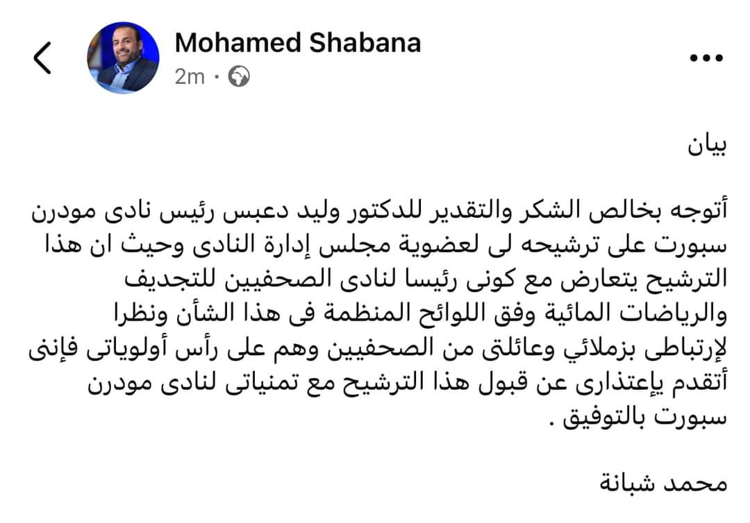 قدم الإعلامي محمد شبانة، اعتذاره عن عدم قدرته على قبول ترشحه من قِبل الدكتور وليد دعبس رئيس نادي مودرن سبورت، لكي يكون ضمن أعضاء مجلس إدارة النادي.
