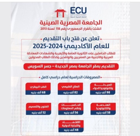 وينشر القاهرة 24، قيمة المصروفات بكليات الجامعة المصرية الصينية للعام الدراسي الجديد 2024-2025 لطلاب الثانوية العامة وأولياء أمورهم في السطور التالية، والتي جاءت على النحو التالي: