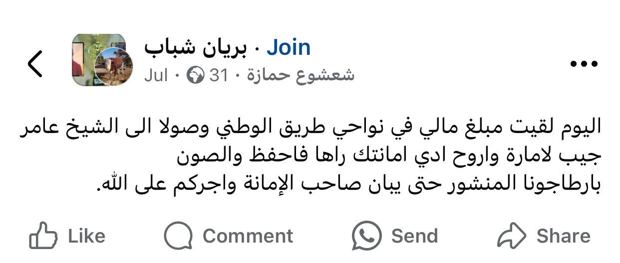 وشارك متابعو منصة فيسبوك في الجزائر باحثًا عن صاحب هذا المبلغ قائلًا: اليوم لقيت مبلغ مالي في نواحي طريق الوطني وصولًا إلى الشيخ عامر جيب لإمارة، وأروح أعطيه الأمانة، هي في الحفظ والصون.. شاركوا المنشور حتى يظهر صاحب الأمانة وأجركم على الله.
