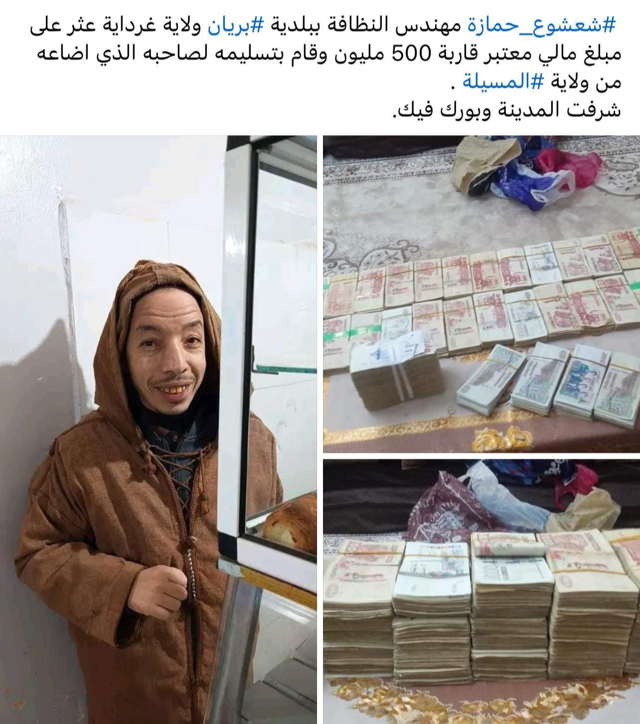 وجد عامل النظافة حمازة شعشوع الذي يبلغ من العمر 38 عامًا، من منطقة غرداية في الجزائر، كيسًا بلاستيكي وسط القمامة أثناء قيامه بعمله، ولكنه أعاد المبلغ لصاحبه بعد أن حاول الوصول إليه من خلال مواقع التواصل الاجتماعي.