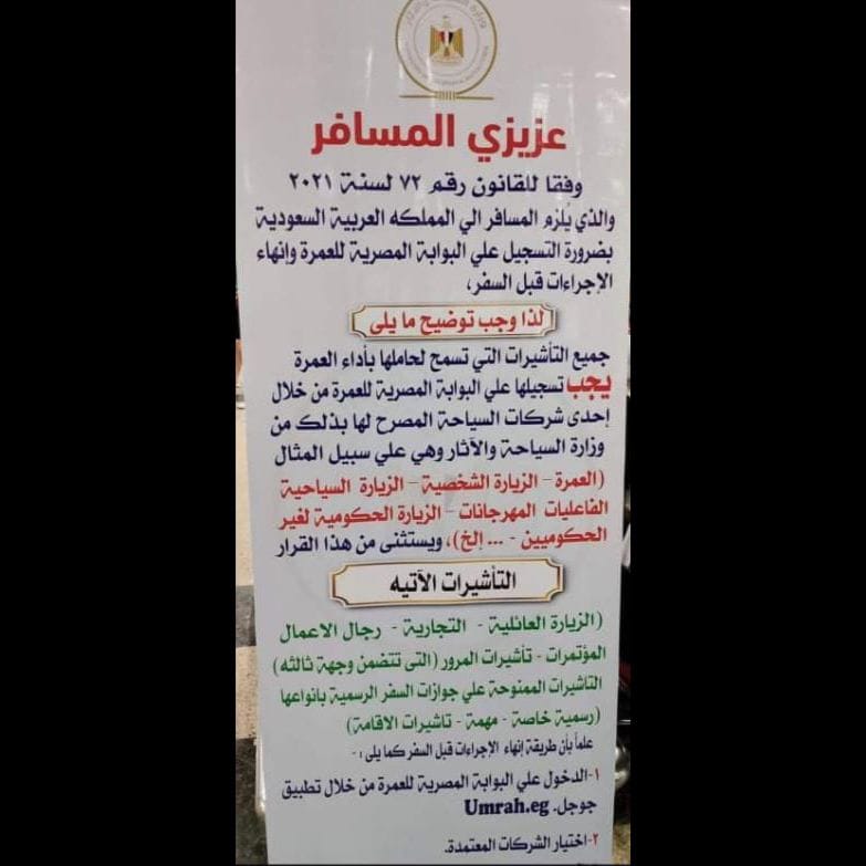 وجاء نصها كالتالي: عزيزي المسافر، وفقًا للقانون رقم 72 لسنة 2021 والذي يلزم المسافر إلى السعودية، بضرورة التسجيل على البوابة المصرية للعمرة وإنهاء الإجراءات قبل السفر، لذا وجب توضيح ما يلى: