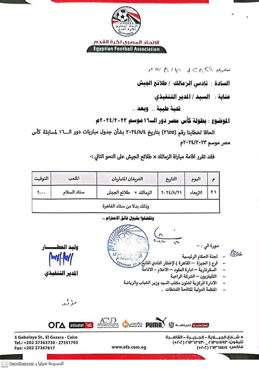 وقرر اتحاد الكرة ولجنة المسابقات نقل مباراة الزمالك وطلائع الجيش ضمن مواجهات دور الـ16 لكأس مصر إلى ستاد السلام بدلًا من ستاد القاهرة الدولي، في اللقاء المقرر له يوم 21 أغسطس من الشهر الجاري.