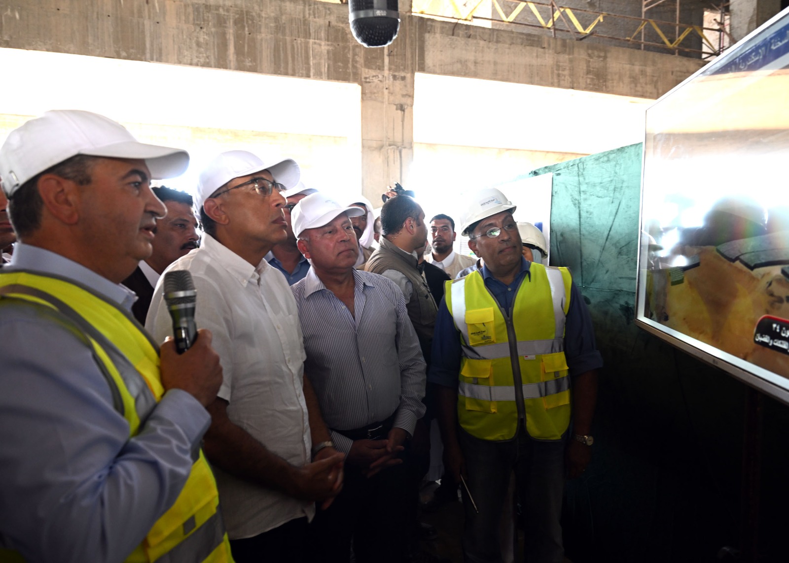 توجه الدكتور مصطفى مدبولي، رئيس مجلس الوزراء، ومرافقوه، لتفقد أعمال إنشاء محطة رأس الحكمة التى يتم تنفيذها ضمن مشروع الخط الأول من شبكة القطار الكهربائي السريع، حيث كان فى استقبالهم مسئولو وزارة النقل.