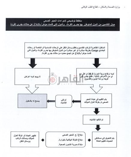 وفي خطاب حصل عليه القاهرة 24، شددت وزارة الصحة على أقسام الحجر الصحي بالمناظرة الصحية لجميع القادمين من كل دول العالم عن طريق الكاميرات الحرارية أو البوابات الحرارية أو أجهزة قياس درجة الحرارة عن بعد، التي تنفذها أطقم الحجر الصحي في منافذ الدخول.