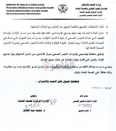 كما شددت على اتخاذ الاحتياطات القصوى لمكافحة العدوى عند التعامل مع الحالات المشتبهة، وعزل الحالة المشتبه بإصابتها بمرض جدري القرود فور اكتشافها وفصلها عن مسار الركاب، وإعادة تقييمها في عيادة الحجر الصحي أو بغرفة العزل المؤقت، ومن ثم يتم التحويل إلى مستشفى الحميات لتقييم الحالة، ويتم إخطار الغرفة الوقائية والإدارة العامة للحجر الصحي ومديرية الشؤون الصحية التابعة لها.