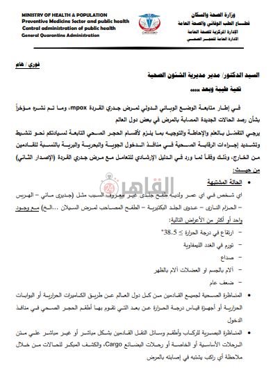 وجهت وزارة الصحة والسكان، ممثلة في قطاع الطب الوقائي، أقسام الحجر الصحي في مديريات الشؤون الصحية، بتنشيط وتشديد إجراءات الرقابة الصحية على القادمين من الخارج، بمنافذ الدخول المختلفة، خصوصا الدول المتوطن بها مرض جدري القرود أو ظهرت بها حالات، لرصد الحالات المشتبهة بها والتعامل معها.