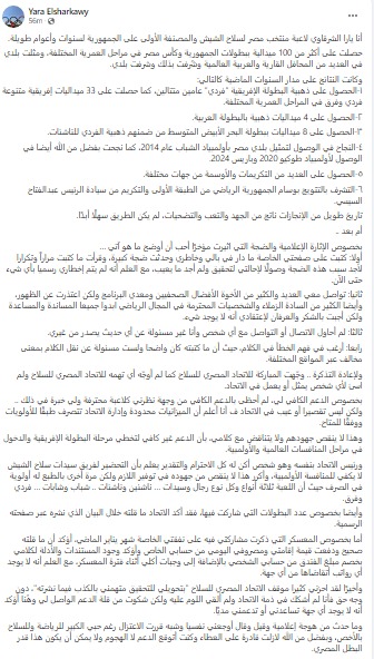 وأكدت يارا الشرقاوي في منشور لها عبر صفحتها الرسمية على موقع التواصل الاجتماعي فيسبوك، أنها حققت العديد من الميداليات للمنتخب المصري في مشوارها بالعديد من البطولات.