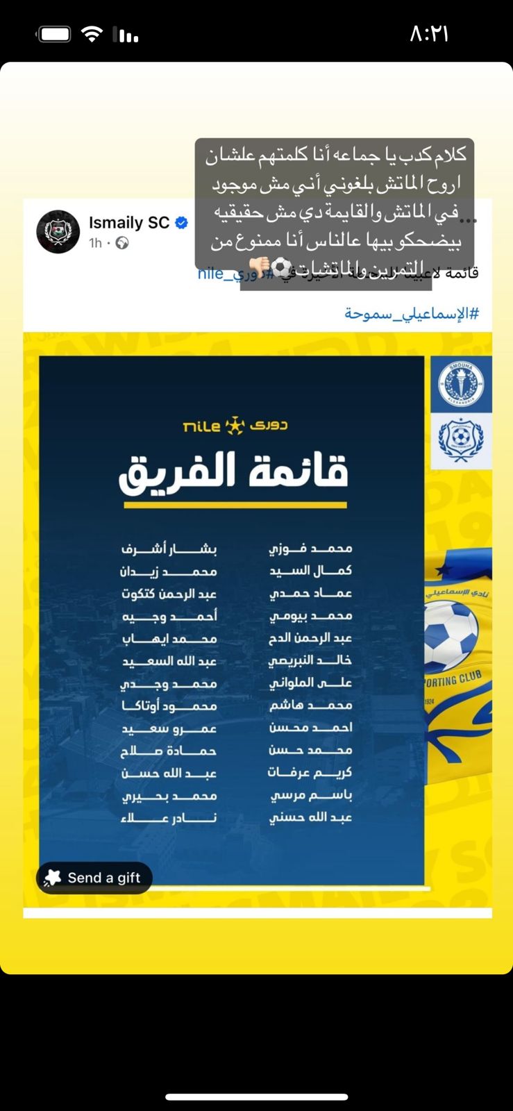 كلام كدب يا جماعة أنا كلمتهم عشان أروح الماتش، بلغوني إني مش موجود في الماتش والقايمة دي مش حقيقية بيضحكوا بيها على الناس، وأنا ممنوع من التمرين والماتشات.