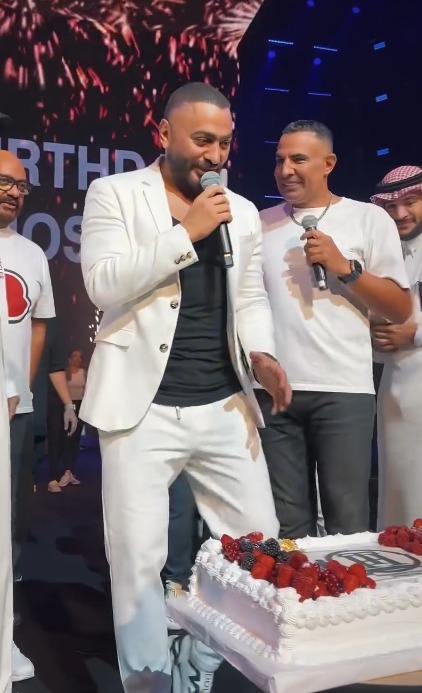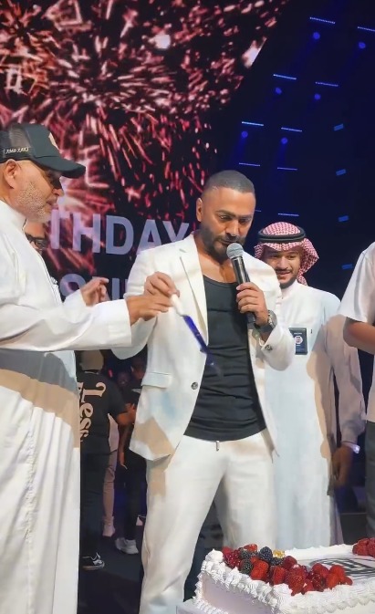 الجمهور السعودي يفاجئ تامر حسني بتورتة احتفالًا بعيد ميلاده خلال إحيائه حفلًا في جدة