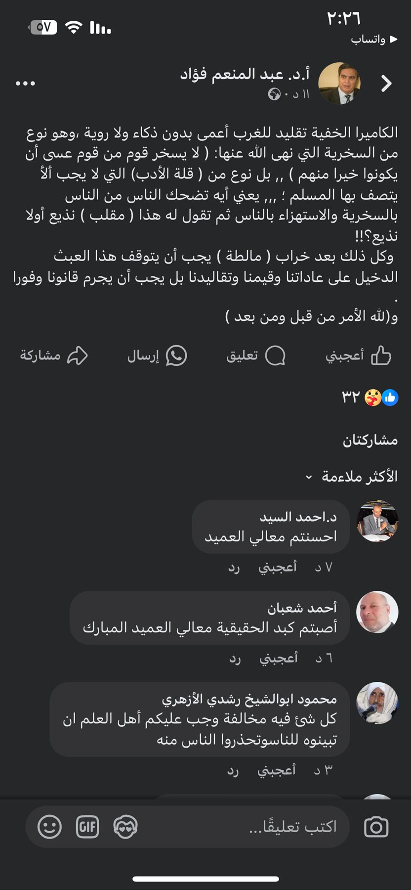 وتابع عبد المنعم فؤاد في منشور له عبر صفحته الرسمية بموقع التواصل الاجتماعي فيسبوك: وهو نوع من السخرية التي نهى الله عنها حيث قال الله تعالى: لا يسخر قوم من قوم عسى أن يكونوا خيرا منهم.