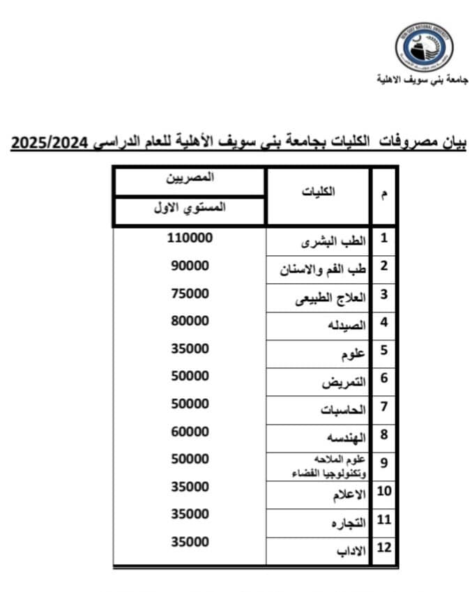 - رسوم كلية الآداب البشري في جامعة بني سويف الأهلية للعام الدراسي 2024-2025 إلى 35000 جنيه.