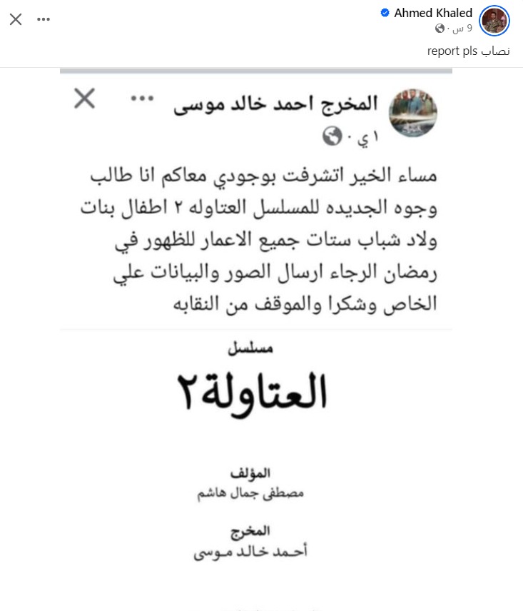 ونشر أحمد خالد موسي مخرج مسلسل العتاولة عبر موقع التواصل الاجتماعي فيس بوك، صورة الحساب المزيف الذي يستغل اسمه من أجل النصب على الممثلين من أجل الحصول على أدوار في المسلسل المقرر عرضه في رمضان 2025.