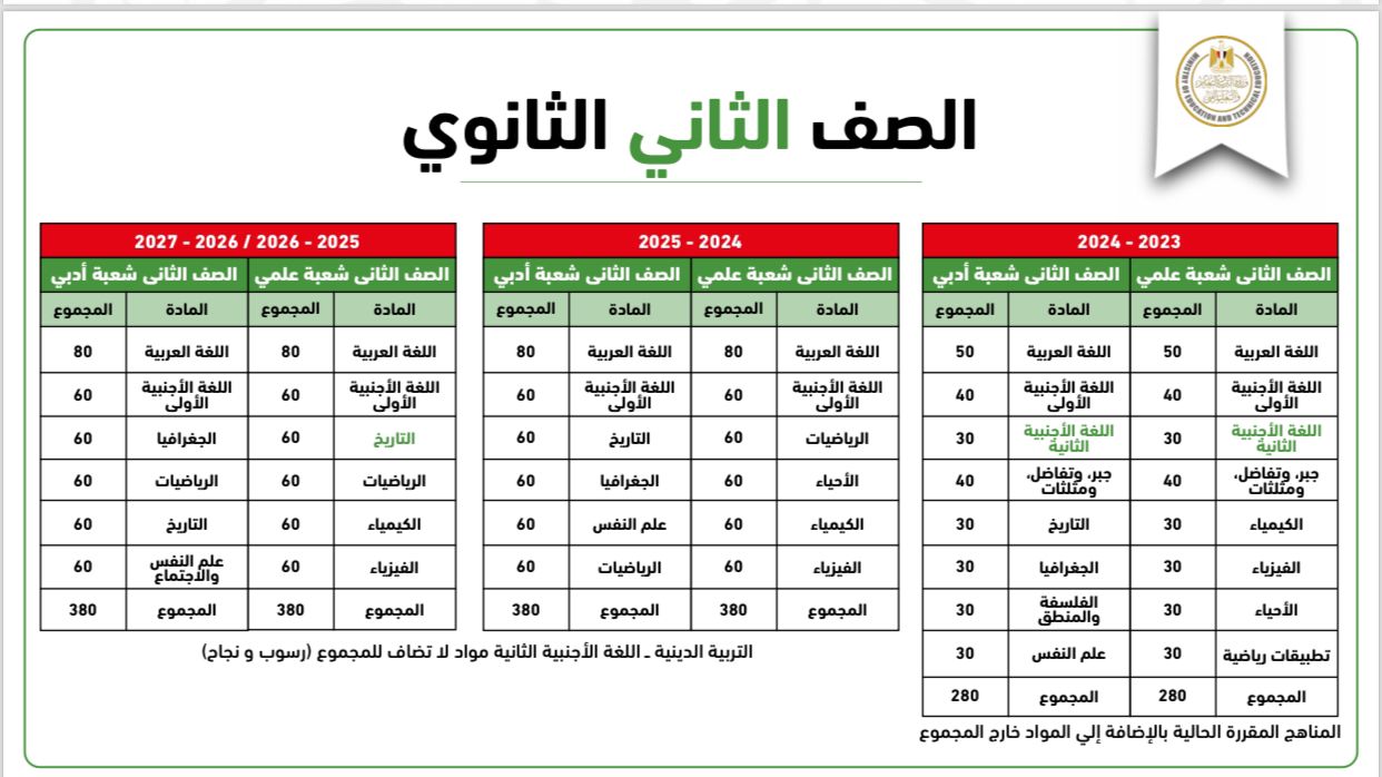 وأشار إلى إجراء تعديلات محدودة على مناهج الصفين الثاني والثالث الثانوي، في ضوء نواتج التعلم، ومراعاة عدم وجود تكرار في المحتوى، والمراجعة العلمية الدقيقة، وتحديث ما يجب تحديثه، بالإضافة إلى دمج ما يمكن دمجه من معارف أو نواتج تعلم، وهو ما أسفر عن جعل اللغة الأجنبية الثانية مادة نجاح ورسوب خارج المجموع، والاستفادة من فتراتها الدراسية في تقوية وزيادة فترات اللغة الأجنبية الأولى، إضافة إلى إعادة تصميم مادة الرياضيات لتكون مادة واحدة، لتصبح المواد التي سيدرسها الطلاب في الصف الثاني الثانوي 6 مواد دراسية بدلًا من 8 مواد في العام الماضي، وهذه المواد بالنسبة للشعبة العلمية ستكون اللغة العربية - اللغة الأجنبية الأولى - الرياضيات - الأحياء - الكيمياء - الفيزياء، ويتم العمل بها في العام الدراسي المقبل 2024/ 2025، على أن يتم إضافة مادة التاريخ بدلًا من الأحياء في العامين الدراسيين المقبلين.