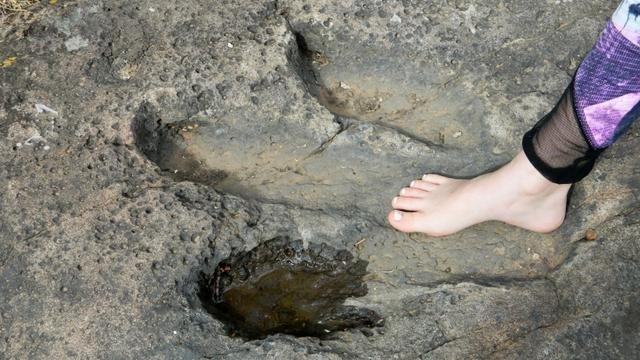 يعتقد علماء الحفريات أن آثار الأقدام، التي يصل طول الواحدة منها إلى 75 سم -30 بوصة-، قد صنعها حيوان عشبي ضخم من أواخر العصر الثلاثي، والآن هناك جهود تبذل للتحقق منها.