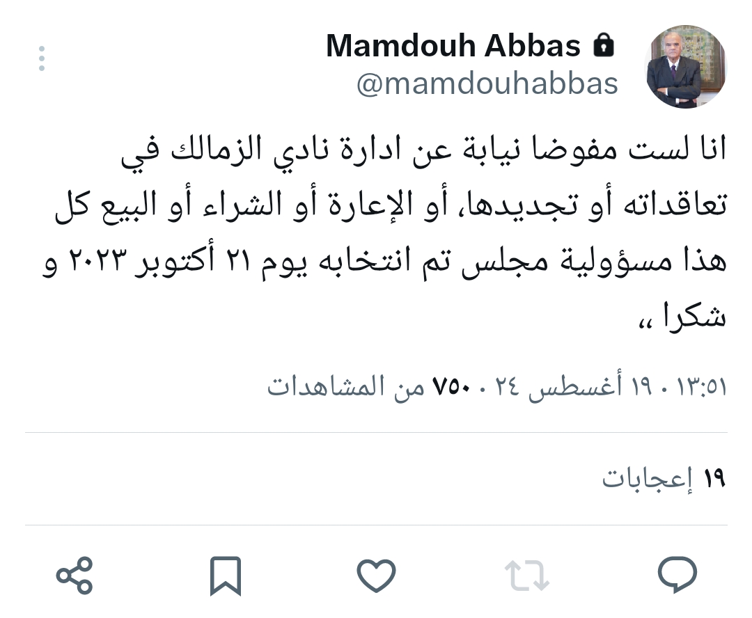 وكتب عباس في تغريدة عبر منصة x: أنا لست مفوضا نيابة عن إدارة نادي الزمالك في تعاقداته أو تجديدها، أو الإعارة أو الشراء أو البيع.. كل هذا مسؤولية مجلس تم انتخابه يوم 21 أكتوبر 2023 وشكرا.