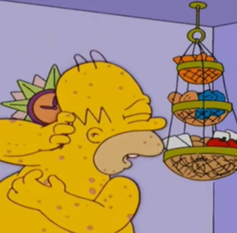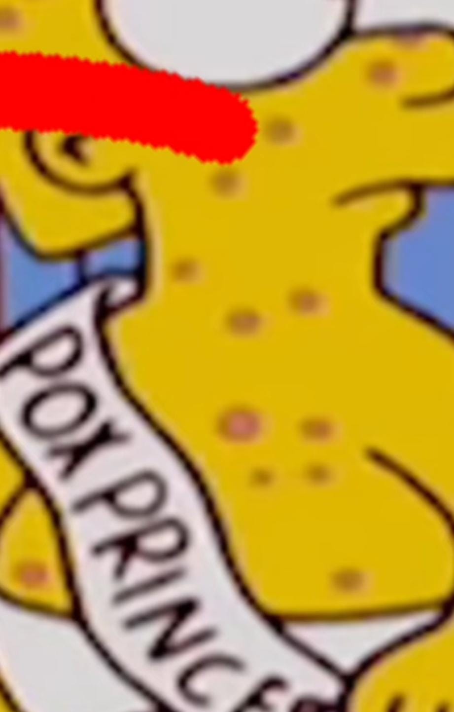 الصورتان اللتان تظهران الشخصية الرئيسية بطفح جلدي أحمر هما من الحلقة الثالثة من الموسم السابع عشر، بعنوان Milhouse of Sand and Fog، ويمكن مشاهدة أحد إطارات الحلقة لعام 2005، وفي سياق الحبكة، تصاب الشخصية الرئيسية هومر، بجدري الماء، وليس جدري القرود، بعد إصابة ابنته ماجي، ولكن جدري القرود وجدري الماء من الأمراض الفيروسية، إلا أنهما ناجمان عن فيروسين مختلفين.
