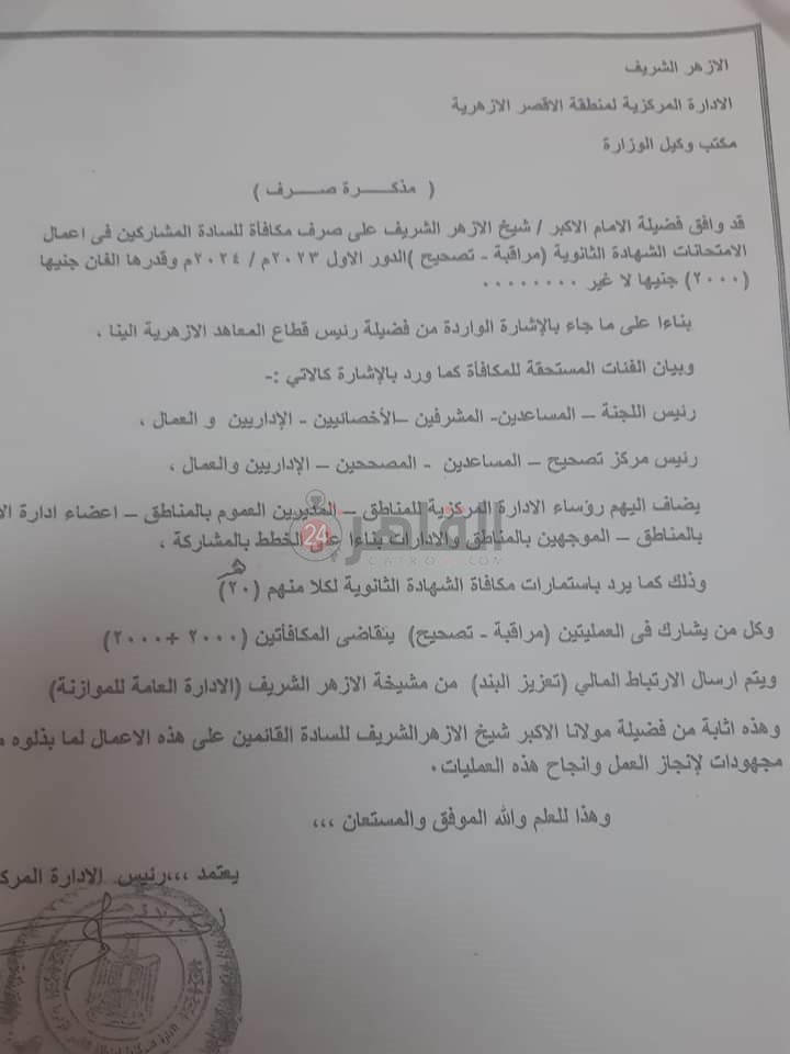 ووفقًا للمستند فإن كل من يشارك في العمليتين مراقبة - تصحيح يتقاضى المكافأتين، ويتم إرسال الارتباط المالي - تعزيز البند - من مشيخة الأزهر الشريف بالإدارة العامة للموازنة، وهذه إثابة من الإمام الأكبر شيخ الأزهر الشريف للقائمين على هذه الأعمال لما بذلوه من مجهودات لإنجاز العمل وإنجاح هذه العمليات.