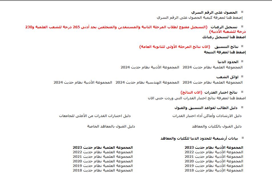 يقوم الطالب بالدخول على رابط تسجيل رغبات المرحلة الثانية 2024 للثانوية العامة، إذ فتح مكتب التنسيق باب تسجيل قائمة الرغبات لجميع الشعب علمي علوم- علمي رياضة – أدبي، لإدخال قائمة الرغبات، حيث كشفت وزارة التعليم العالي والبحث العلمي عن الحد الأدنى للشعبة العلمية، التي وصلت إلى 265 درجة فأكثر أي بنسبة 64.63%، فيما جاء الحد الأدنى للشعبة الأدبية عند 230 درجة فأكثر أي بنسبة 56.09%.