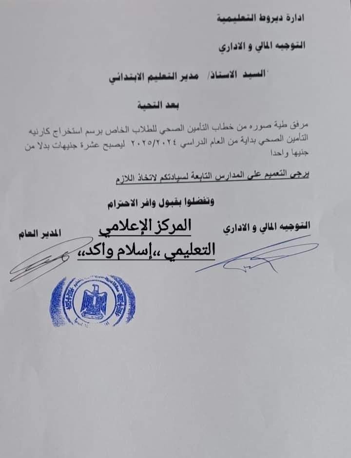 أعلنت الإدارات التعليمية، أنها تلقت خطابًا رسميًا من التأمين الصحي، بشأن رسوم استخراج كارنيه التأمين الصحي لطلاب المدارس بداية من العام الدراسي الجديد 2024 / 2025.