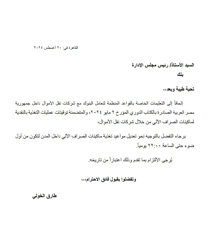 ويأتي ذلك إلحاقًا إلى التعليمات الخاصة بالقواعد المنظمة لتعامل البنوك مع شركات نقل الأموال داخل مصر، الصادرة بالكتاب الدوري المؤرخ 2 مايو الماضي، والمتضمنة توقيتات عمليات التغذية بالنقدية لماكينات الصراف الآلي من خلال شركات نقل الأموال.