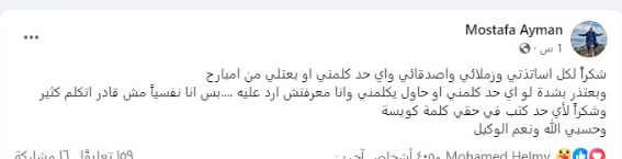 وقال طبيب مستشفى عين شمس، في منشور له عبر صفحته الشخصية بموقع التواصل الاجتماعي فيسبوك: شكرًا لكل أساتذتي وزملائي وأصدقائي وأي حد كلمني أو بعتلي من امبارح، وبعتذر بشدة لو أي حد كلمني أو حاول يكلمني وأنا معرفتش أرد عليه، مضيفًا أن حالته النفسية سيئة جراء ما حدث معه، مردفًا: نفسيًا مش قادر اتكلم، وشكرًا لأي حد كتب في حقي كلمة كويسة.. وحسبي الله ونعم الوكيل.