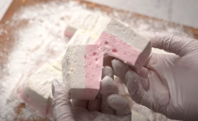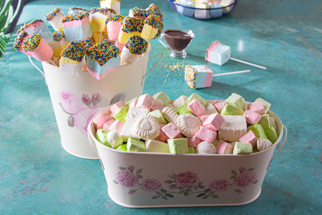 - غلفي قطع المارشميلو بالنشا والسكر البودر وقدميه لأطفالك بالهنا، مع العلم أن خليط النشا والسكر البودر مكون أساسي لحفظ المارشميلو بدون أن يذوب أو يلتصق ببعضه.