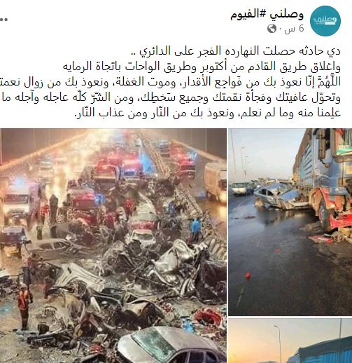 خلال الساعات الماضية، تداول مستخدمو مواقع التواصل الاجتماعي، صورة تفيد أنها من مكان حادث تصادم عدد من السيارات بطريق الدائري، ونستعرض لكم حقيقة الصور المتداولة لحادث الدائري.