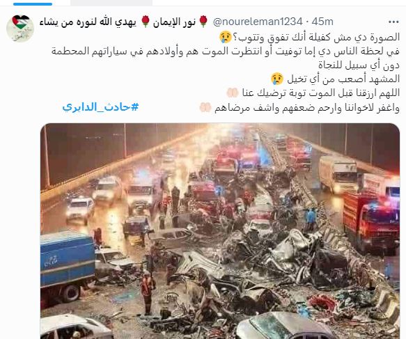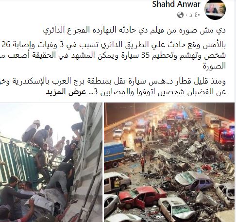 والصورة المنتشرة على السوشيال ميديا، كان مرفق بها عبارة متكررة جائت كالتالي، وهي دي مش صورة من فيلم دي حادثة النهارده الفجر على الدائري، وتلك العبارة أدت إلى نشر الذعر في نفوس جمهور السوشيال ميديا.