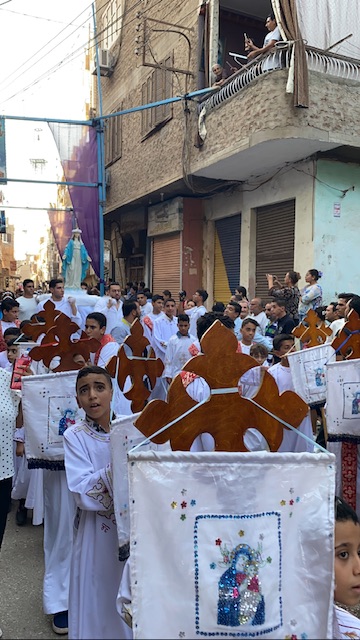 وشهد الاحتفال طواف عدد من الشمامسة أرجاء الكنيسة، حاملين الشموع والصلبان التي تعلوها صور العذراء مريم ومن خلفهم الأب الأسقف والآباء الكهنة حاملين أيقونة السيدة العذراء، وسط أصوات التراتيل والتماجيد المطوبة للعذراء مريم وسط فرحة من شعب الكنيسة الذي تهافت لأخذ البركة من أيقونة العذراء.