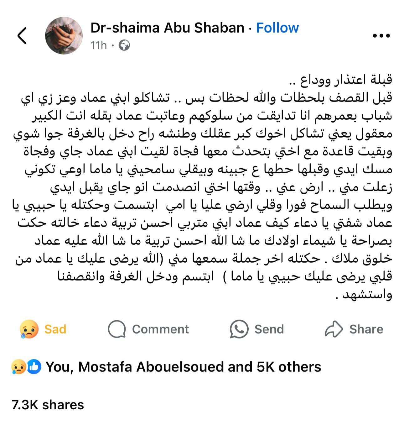 وأضافت: فجأة لقيت ابني عماد جاي وفجأة مسك إيدي وقبلها حطها ع جبينه وبيقلي سامحيني يا ماما اوعي تكوني زعلتي مني.. ارض عني.. وقتها اختي انصدمت انه جاي يقبل ايدي ويطلب السماح فورا وقلي ارضي عليا يا امي ابتسمت وحكتله يا حبيبي يا عماد شفتي يا دعاء كيف عماد ابني متربي احسن تربية دعاء خالته حكت بصراحة يا شيماء اولادك ماشاالله احسن تربية ما شا الله عليه عماد خلوق ملاك.