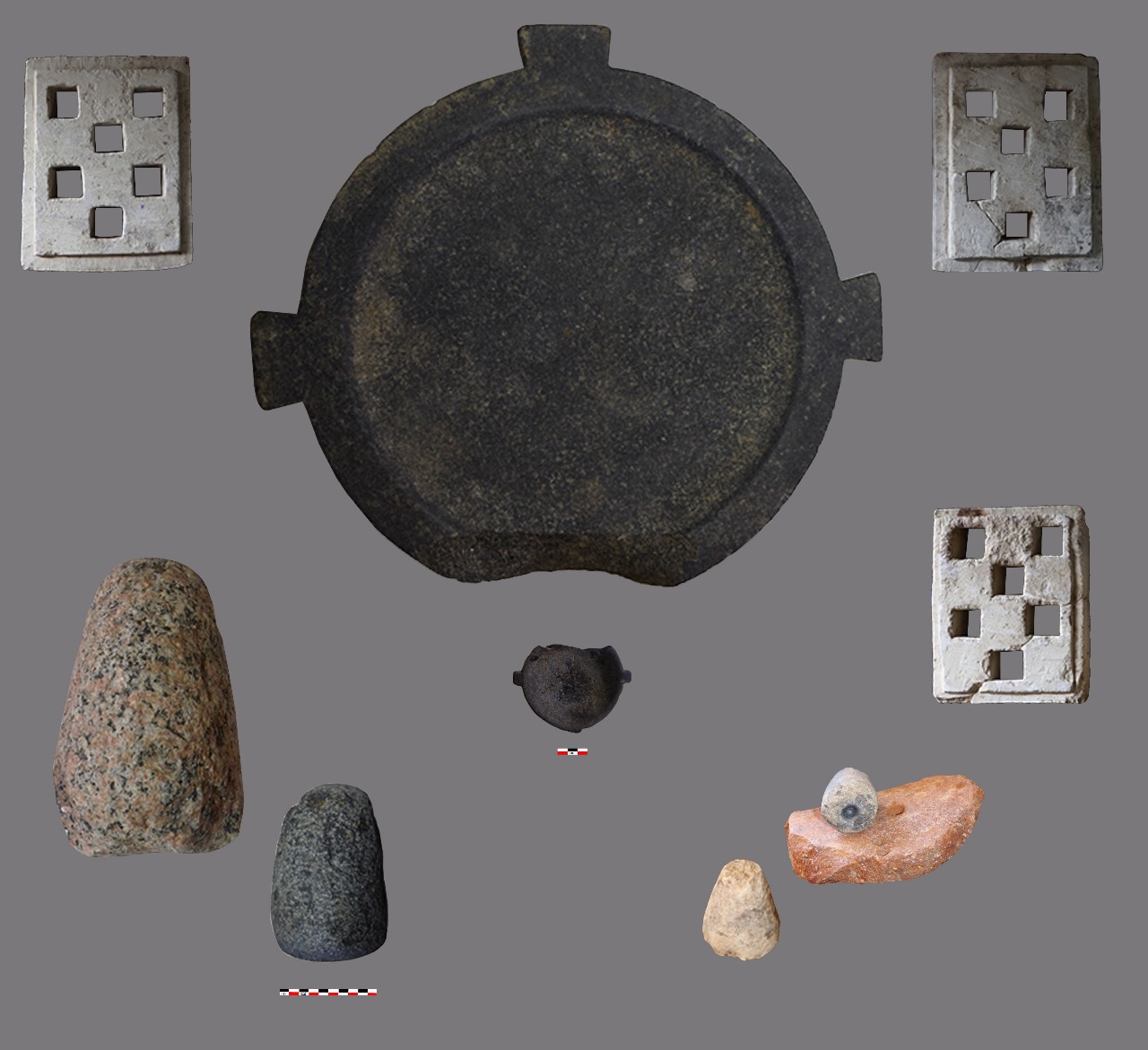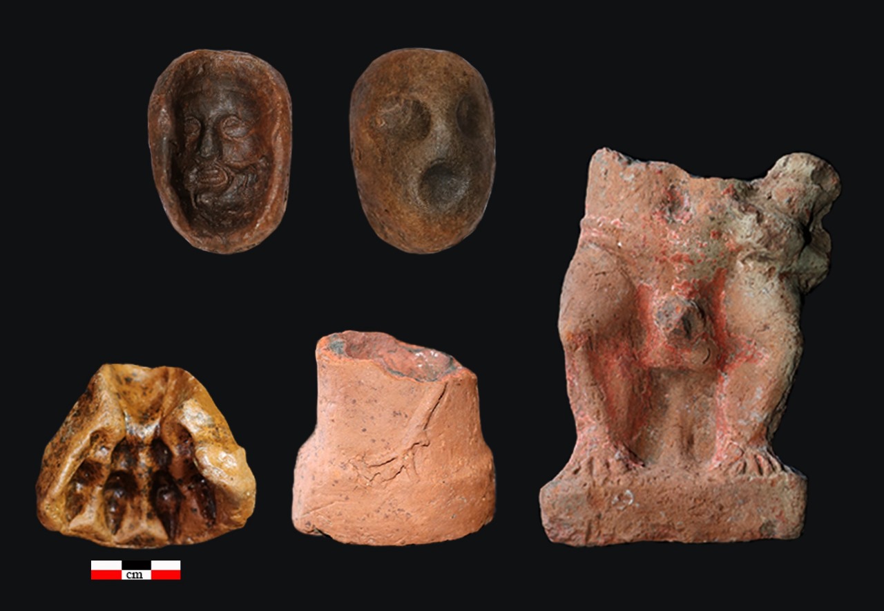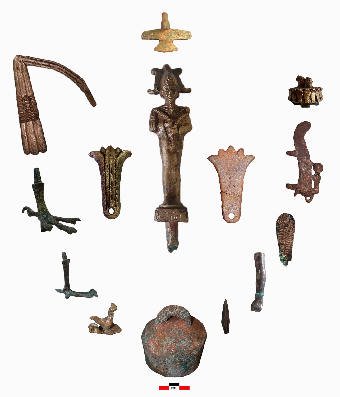 وكذلك عثر على تمثال أوزير والنمس من البرونز، وتمثال تراكوتا للمعبود بس، وقلادة المنيت من الفاينس وبعض بقايا لوحات حجرية عليها بعض النقوش وموائد قرابين وبعض الأغطية لأمفورات من الملاط عليها بقايا أختام ترجع للعصر الصاوي، بالإضافة إلى تمثال للمعبود بتاح من الفاينس الأزرق، وبعض الرموز الدينية من الفاينس والتي تمثل أشكال مركبة للجد والواس والتاج المركب، وبعض اللقى الأثرية من الفخار المختلفة في الأشكال والأحجام المستخدمة في الطقوس الدينية والحياة اليومية.