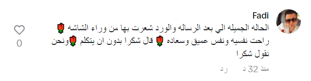 فيما أضاف العديد من مستخدمي منصة التيك توك الكثير من التعليقات على هذا الفيديو، وشارك أحد المتابعين، قائلًا: أجمل حاجه في الدنيا جبر الخواطر، وآخر كتب: الحالة الجميلة الي بعد الرسالة والورد شعرت بها من وراء الشاشة، راحة نفسية ونفس عميق وسعادة، قال شكرًا بدون ما يتكلم ونحن نقول شكرًا.