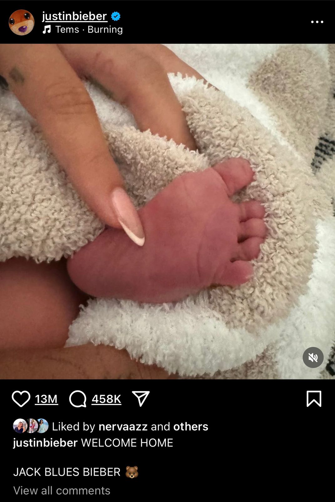 أعلن المغني الكندي جاستن بيبر عن ولادة طفله الأول من زوجته هايلي بيبر، وفي منشور على إنستجرام، شارك بيبر صورة لقدم طفله الرضيع، مرفقًا تعليقًا قال فيه: مرحبًا بك في المنزل، وكشف عن اسم الطفل وهو جاك بلوز بيبر.