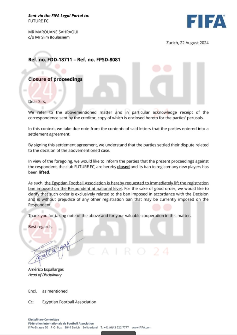ووصل خطاب من الاتحاد الدولي لكرة القدم فيفا إلى نادي مودرن سبورت يفيد برفع إيقاف القيد لدى نادي مودرن سبورت بعد تسوية المستحقات المتأخرة لدى التونسي مروان الصحراوي مدافع الفريق السابق.