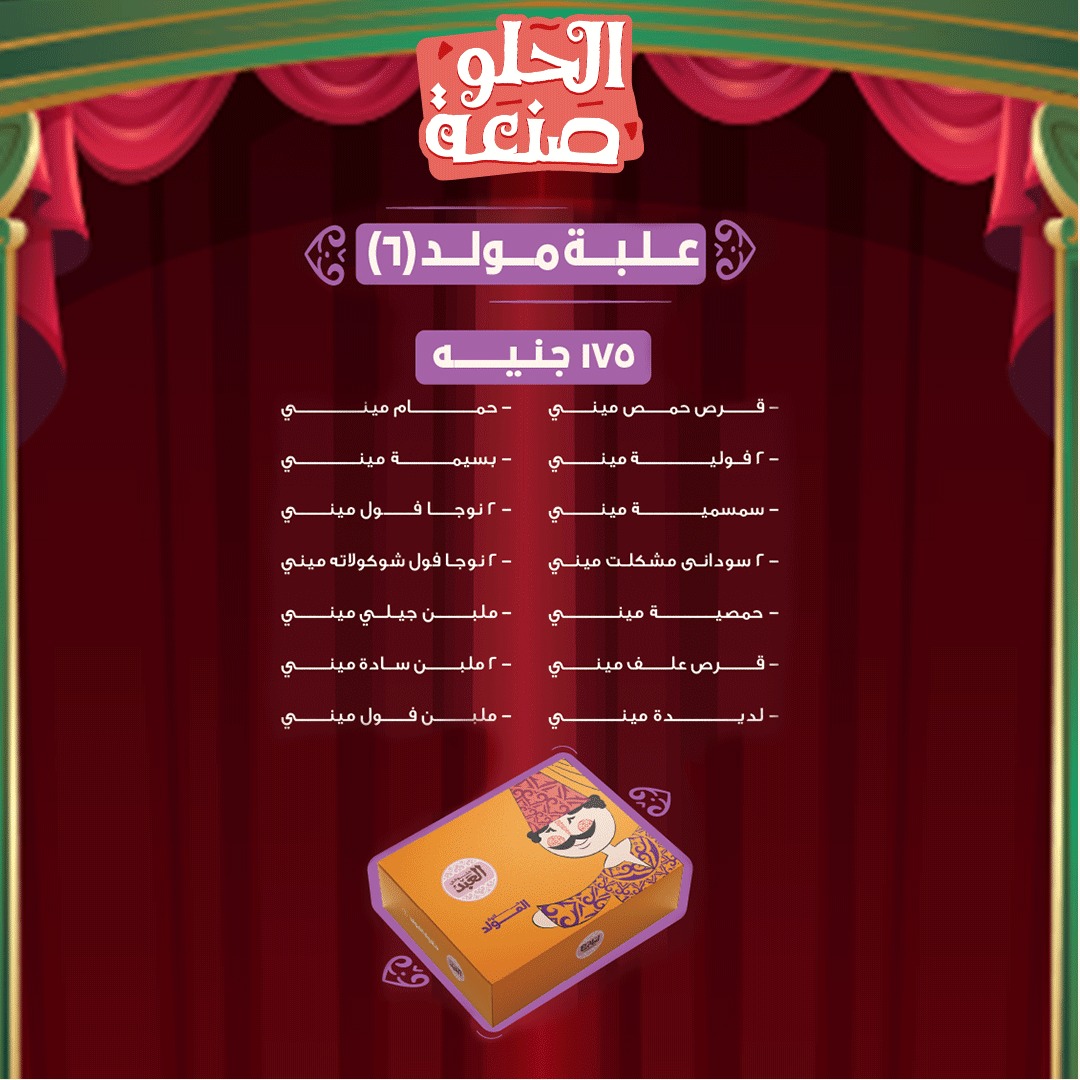 وفيما يخص أسعار حلاوة المولد 2024 العبد، فقد نشر أشهر محلات الحلوى في مصر، أسعار الحلويات عبر الصفحة الرسمية بموقع التواصل الاجتماعي فيس بوك، فقد بدأ سعر العلبة من 2600 جنيه إلى 120 جنيها، وإليكم أسعار الحلوى ومكونات كل علبة.
