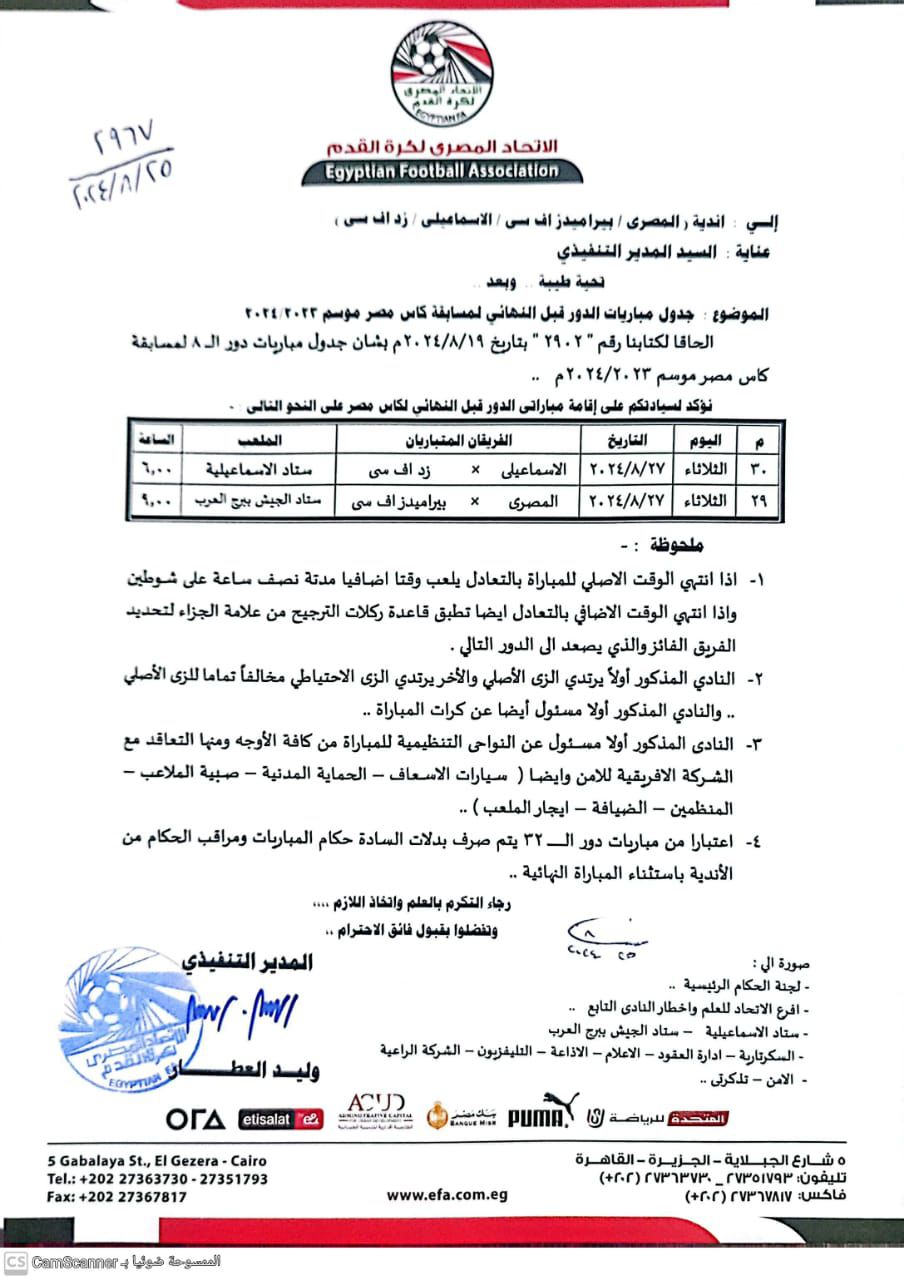أعلنت إدارة المسابقات باتحاد الكرة تحت إشراف عامر حسين عضو اتحاد الكرة، مواعيد مباريات الدور قبل النهائي لكأس مصر حيث تقرر إقامة مباراة الإسماعيلي وزد في السادسة مساء يوم 27 أغسطس الجاري باستاد الإسماعيلية، على أن تقام مباراة بيراميدز والمصري باستاد برج العرب بالإسكندرية في التاسعة مساء يوم 27 أغسطس الجاري.