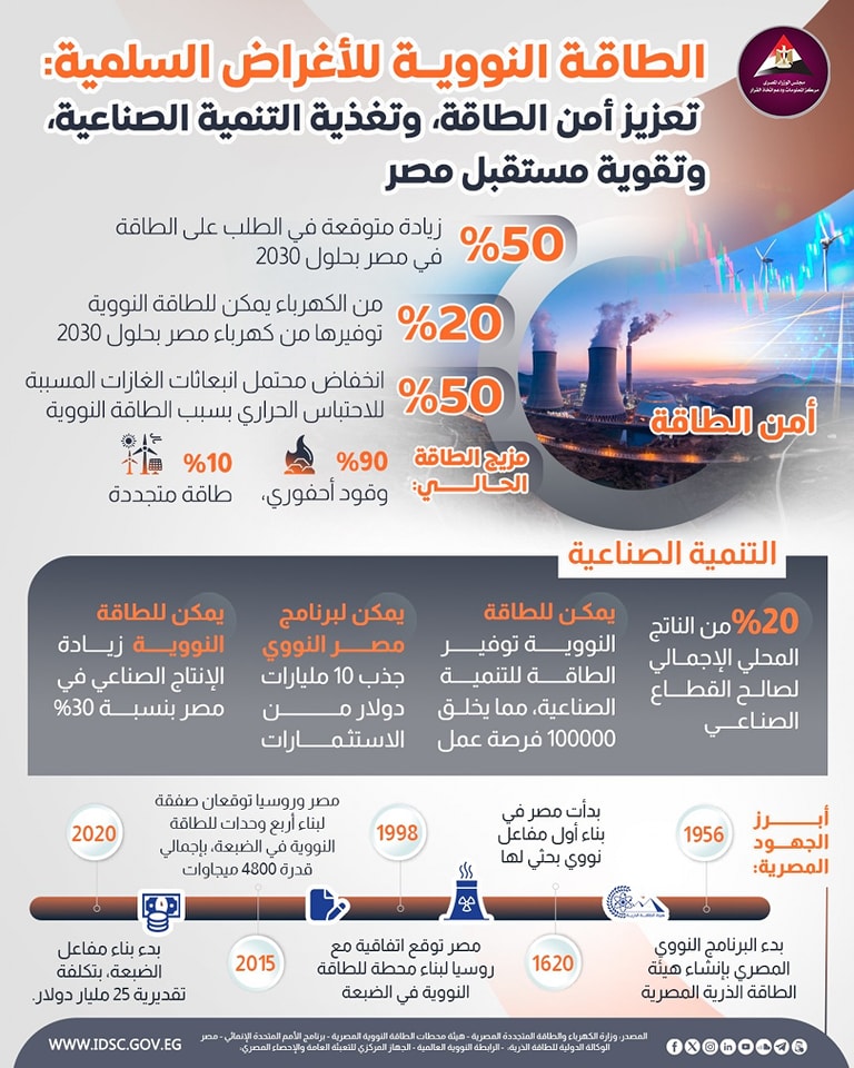 نشر المركز الإعلامي لمجلس الوزراء، إنفوجرافًا على صفحته الرسمية على موقع التواصل الاجتماعي فيسبوك، حيث سلط الضوء من خلاله على أهمية الطاقة النووية للأغراض السلمية وتعزيز أمن الطاقة وتغذية التنمية الصناعية وتقوية مستقبل مصر.