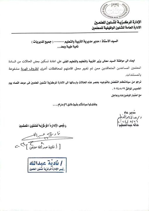 وجهت وزارة التربية والتعليم والتعليم الفني، خطابًا إلى جميع مديري المديريات بجميع المحافظات بشأن إعادة تسكين بعض الحالات من المعلمين المساعدين المتعاقدين ممن تم تغيير محل اقامتهم لمحافظات أخرى.