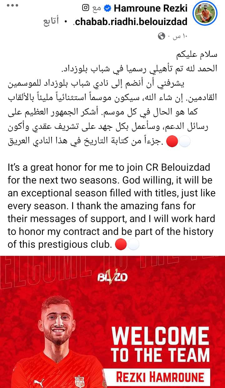 وكتب رزقي حمرون على صفحته الشخصية عبر موقع التواصل الاجتماعي فيس بوك: سلام عليكم، تم تأهيلي رسميا في شباب بلوزداد، يشرفني أن أنضم إلى نادي شباب بلوزداد للموسمين القادمين، إن شاء الله سيكون موسما استثنائيا مليئا بالألقاب كما هو الحال في كل موسم، أشكر الجمهور العظيم على رسائل الدعم وسأعمل بكل جهد على تشريف عقدي وأكون جزءا من كتابة التاريخ في هذا النادي العريق.